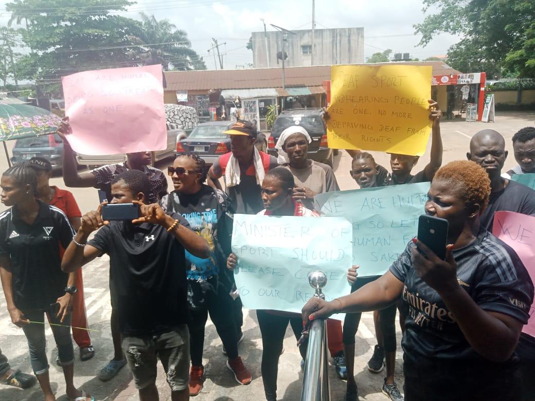 Dr. Sunny Aimufua, Head Coach, Deaf Sports in Edo, who led the protest said the Ministry’s decision was discriminatory.