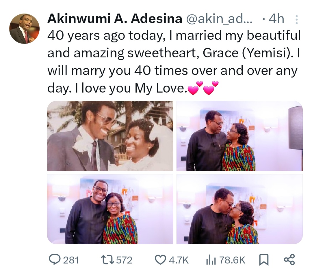 In the caption on X, he wrote: “40 years of loving and treasuring you, Grace (Yemisi) are the best years of my life. One love, one team, one goal. I love you Honey.”