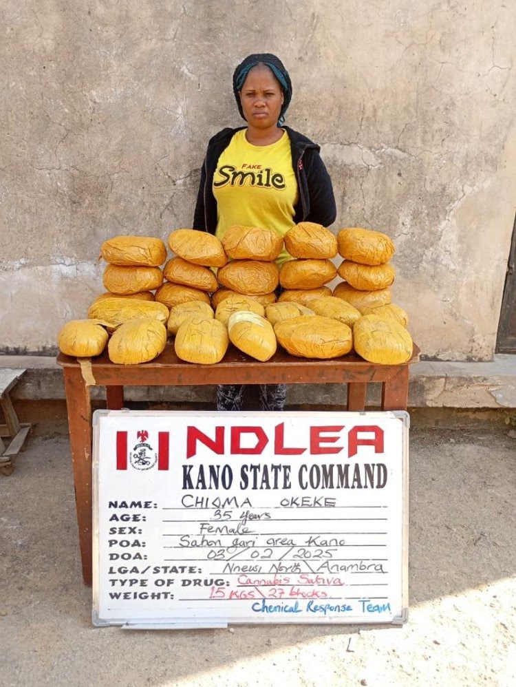 A separate operation in Sabon Gari, Kano, led to the arrest of Chioma Okeke, 35, with 27 blocks of skunk (15 kg of cannabis).