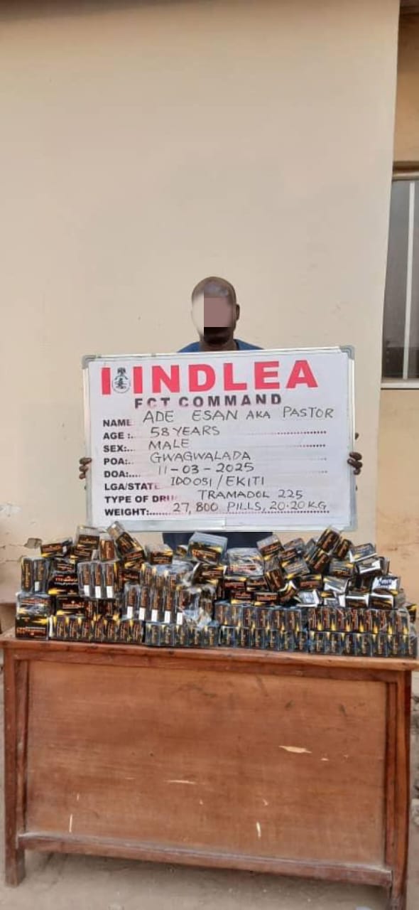 In Abuja, NDLEA officers arrested 58-year-old Ade Esan, also known as Pastor, along the Gwagwalada expressway with 27,800 tramadol 225mg pills in his possession.