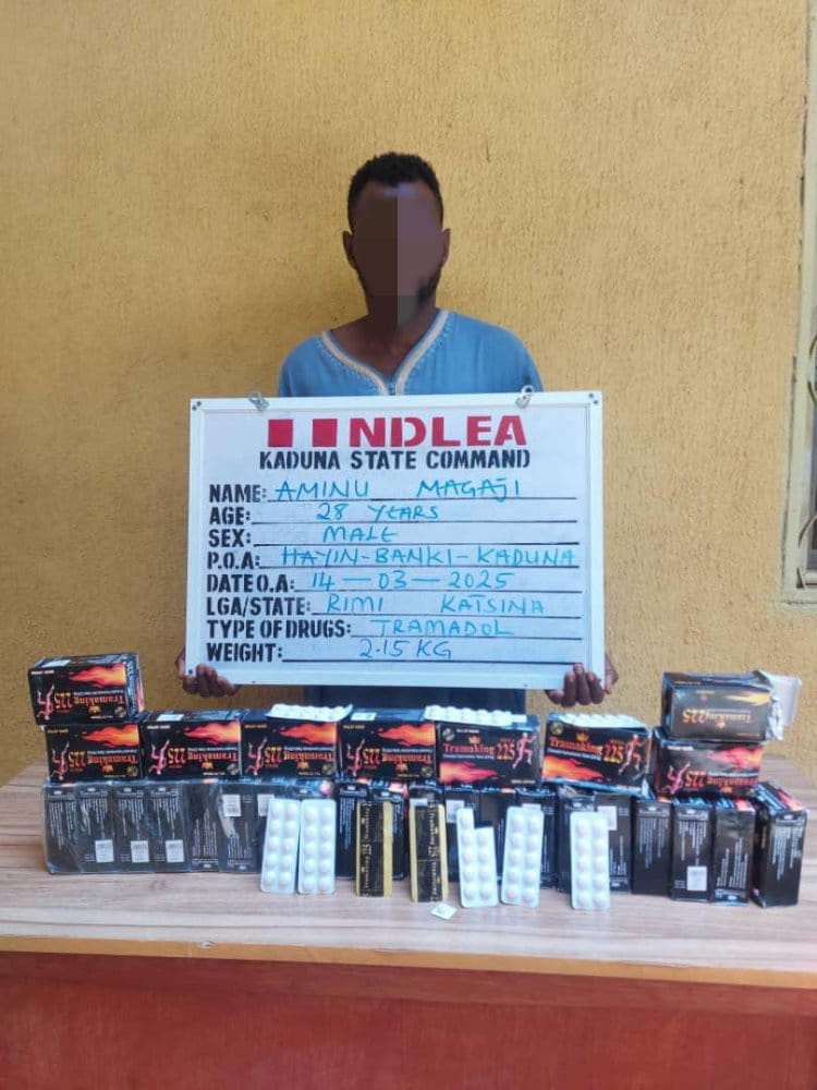 “Raid operations in Kachia, Kaduna state on Thursday 13th March led to the arrest of Idris Hamza, 21, with 4,900 pills of tramadol 225mg seized from him, just as a similar exercise in Hayin Banki area of Kaduna North LGA, on Friday 14th March resulted in the arrest of 25-year-old Aminu Magaji from whom 2,900 tablets of tramadol 225mg were recovered.”